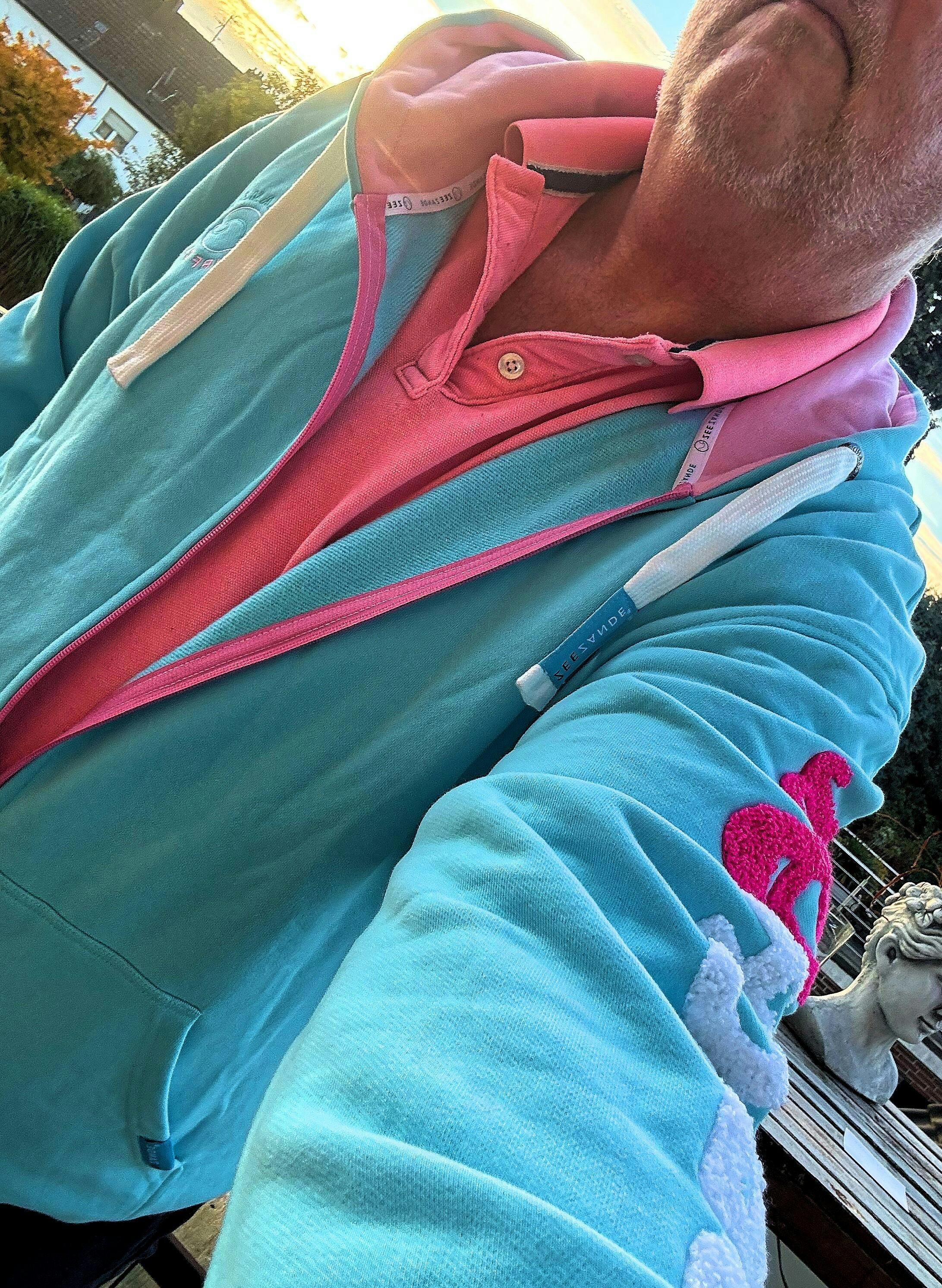 Dieser wunderschöne Sweatjacke in rosa ist besonders schön verarbeitet. Auf der Vorderseite hat er den flauschigen Stick. Auf der Rückseite und beiden Ärmeln verschiedene edle 3D Sticks.